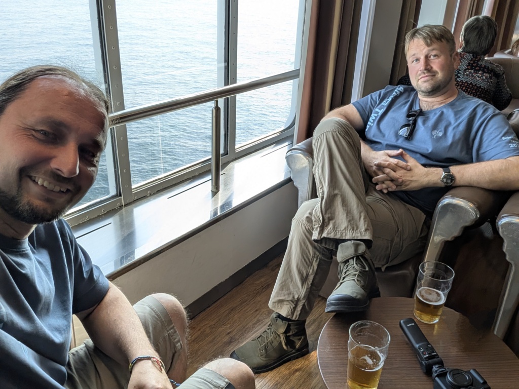 Wir verstauten unser Gepäck, zogen uns um und machten uns auf den Weg zur Bar. Schließlich wollten wir den ersten Abend stilvoll einläuten. Die Fähre legte ab, und wir standen an Deck, der Wind zerzauste unsere Haare (naja, was davon übrig war), und wir blickten hinaus auf die Nordsee. Es war ein Moment zum Einrahmen.