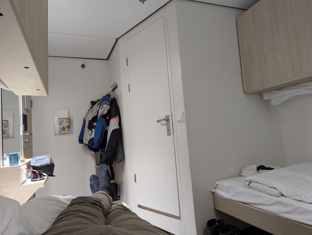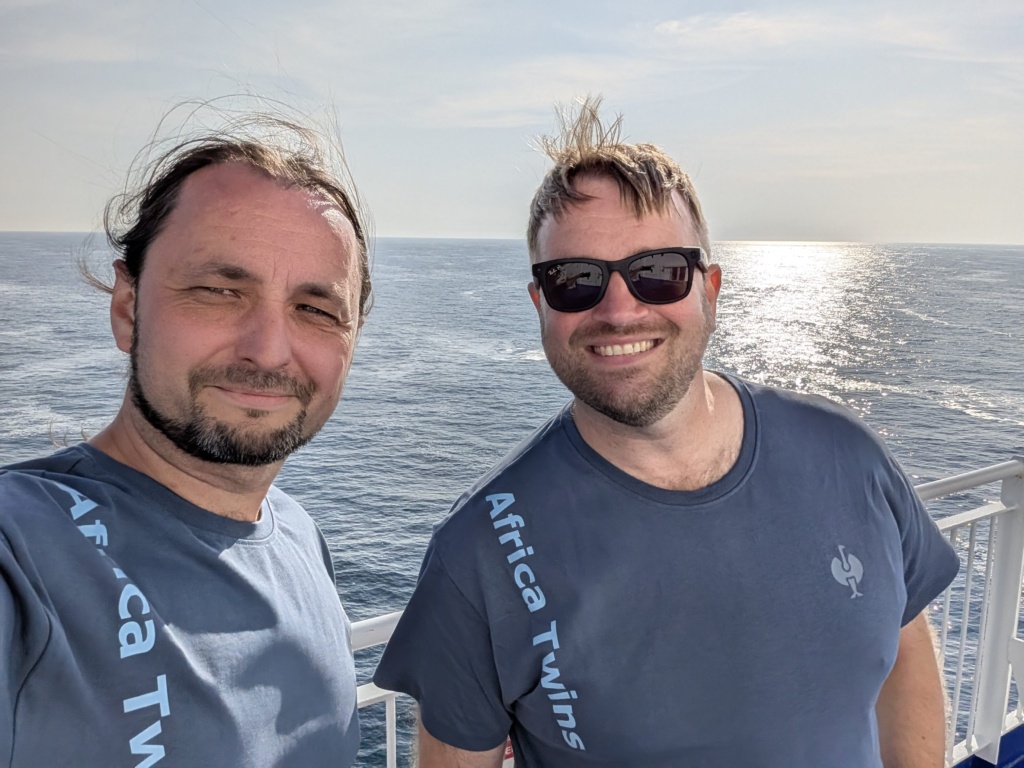 Aber Fortuna war uns wohlgesonnen. Wir kamen pünktlich an. Gerade rechtzeitig, um noch eine Pommes mit Mayo zu inhalieren, bevor wir auf das Schiff rollten. Die Africa Twins wurden verzurrt, wir bekamen unsere Kabinenschlüssel – und dann begann der maritime Teil unseres Abenteuers.
